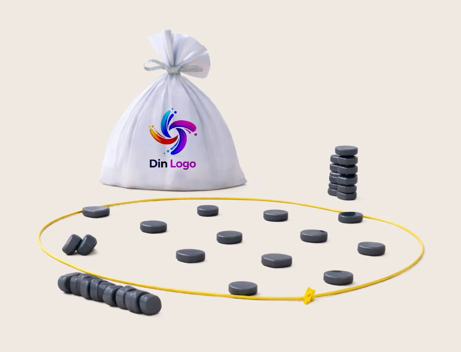 Magnetspill i pose med magnetbrikker og snor.